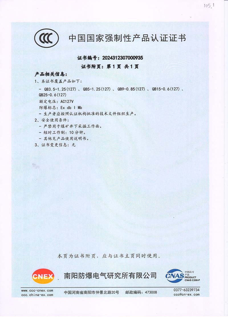 礦用隔爆QB127V 中國國家強制性產品認證證書105.1